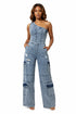 Slanted shoulder tight waist slim fit elastic wash denim jumpsuit